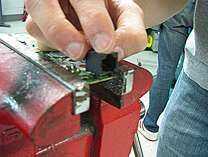 A continuación hacer un tercer agujero cuyo centro coincide con el centro de las filas de pines de la 8P8C. Aumentar el diámetro del agujero hasta que las dos filas de pines de la 8P8C podrían caber el orificio sin tocar los lados de la placa de circuito. Luego con ayuda de una almiar Dremel Rotary herramienta los lados del agujero hasta que todos los pasadores de los pines de puerto Ethernet hembra ajuste sin tocar la placa de circuito.