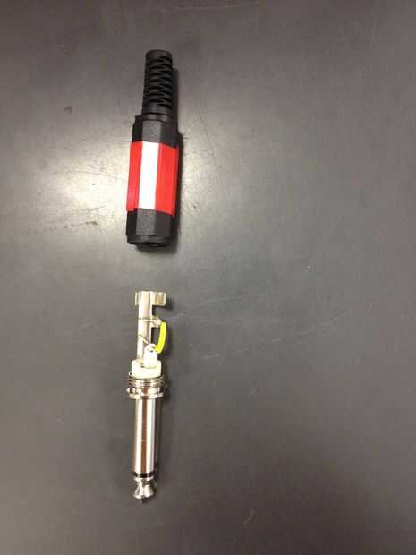 El primer paso de la adición de la llave es para completar la conexión dentro de la pieza masculina de la toma. Abrir al gato sacando el negro del conector de metal. En la pieza de metal, usted verá dos terminales, como se muestra en la foto primera de arriba. Para conectar estos dos terminales, soldar un pedazo corto de alambre entre ellos. Vuelva a enroscar la cubierta y la pieza macho está lista para funcionar.