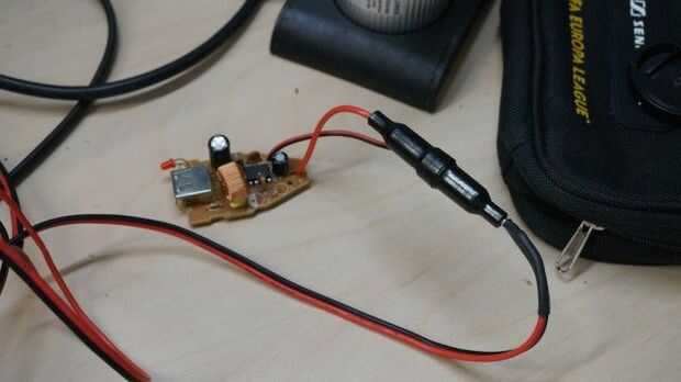 Entonces he desmontado el cargador del teléfono, soldado a dos alambres con un fusible (sólo para estar seguro).
