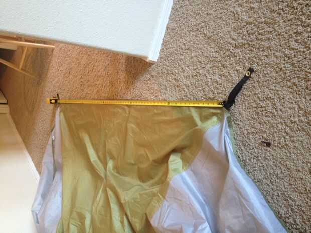 El primer paso es encontrar el punto central del panel de toldo que desea chico hacia fuera. En mi caso, el panel era 71" de largo, así que marqué 35,5" (medio camino). Aplicamos el pegamento y el lazo en la parte inferior del panel toldo, así que lo tienes orientado correctamente.