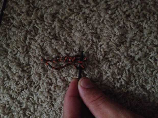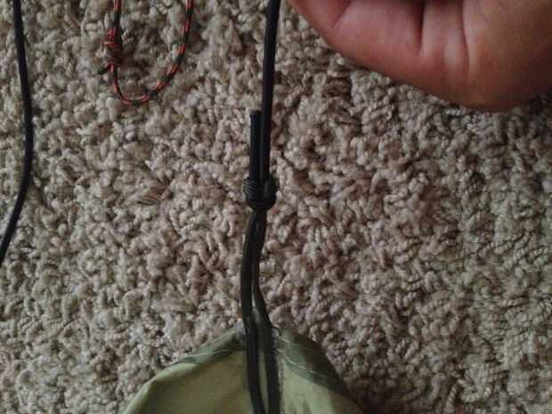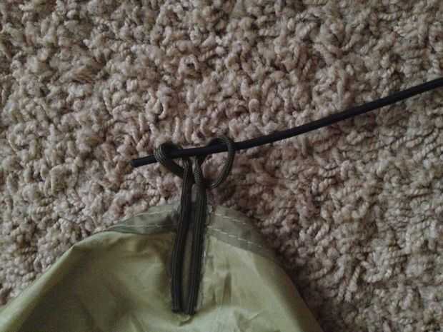 Encontré la forma más fácil de fijar la tipo bungee al anillo de conexión de la tienda recién creado es hacer un ciclo por todo lo alto en la línea de paracord entonces alimentar la línea de tipo bungee a través de ella como se ve en la segunda foto. Simplemente voltear el lazo de la cuerda del amortiguador auxiliar y se han creado esencialmente no cuadrado, ver foto 3.