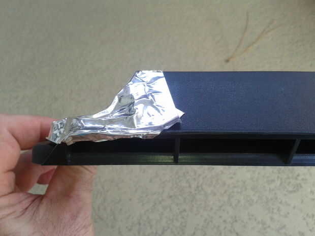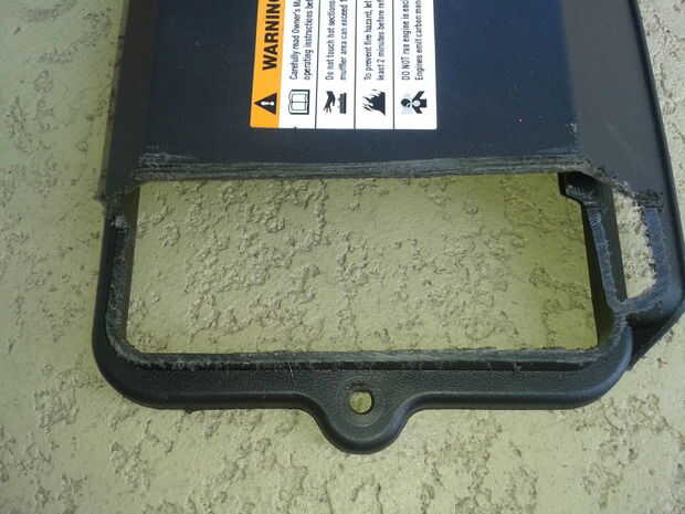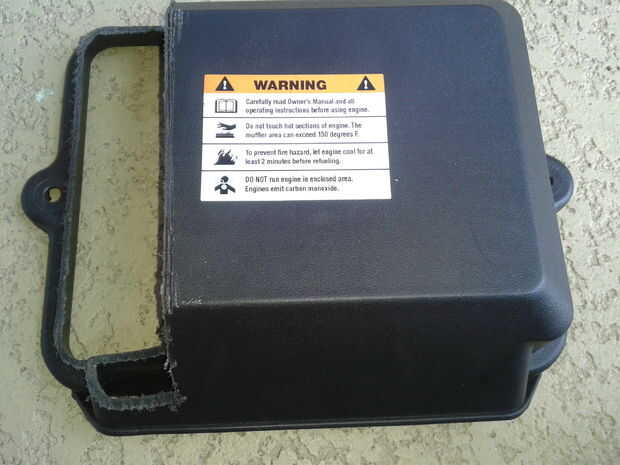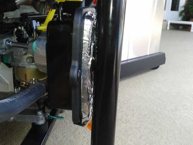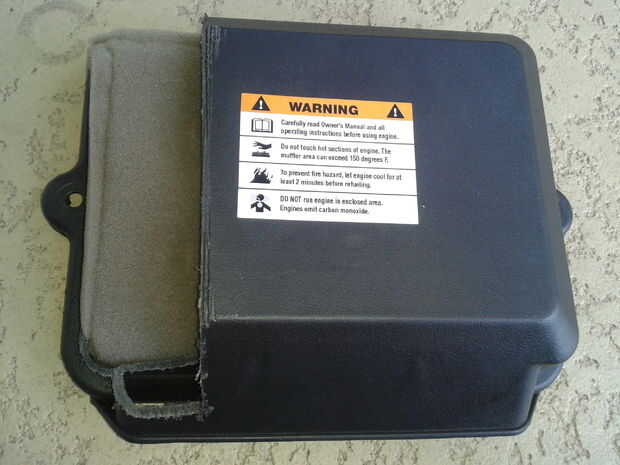 Aproximadamente mide la cantidad de espacio libre necesario, en este caso aproximadamente 3/4 ". Usé una sierra para metales para cortar un "scoop" de la caja de filtro de aire y prueba de ajuste del corte. Cinta adhesiva aluminizada permanente fue utilizado para cubrir el agujero, formado a la forma de "cuchara". Puse un trozo de la cinta en el interior también, para cubrir el lado adhesivo, para no pegar el filtro de aire en la cinta. Después de colocar el material de empaque y filtro, he reinstalado la carcasa del filtro modificado. El generador funcionó entonces como un sueño. No es necesario la corte marco!!!