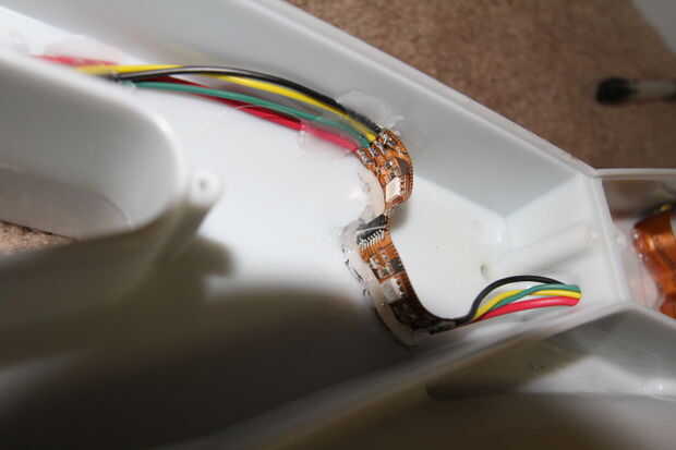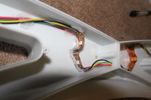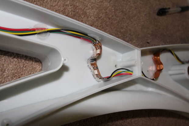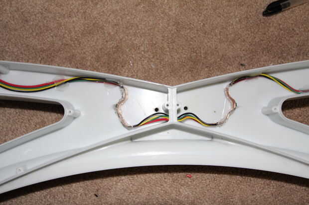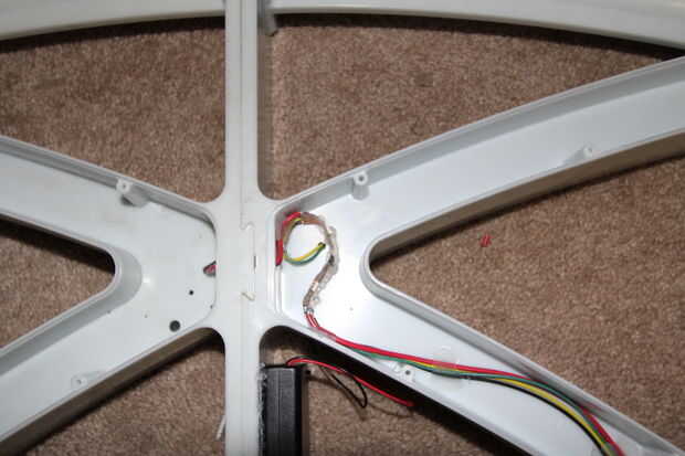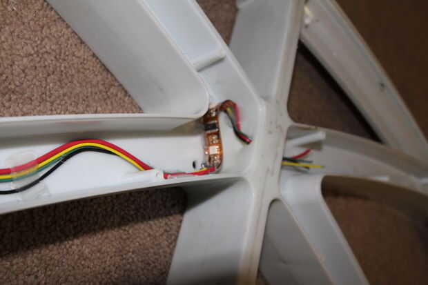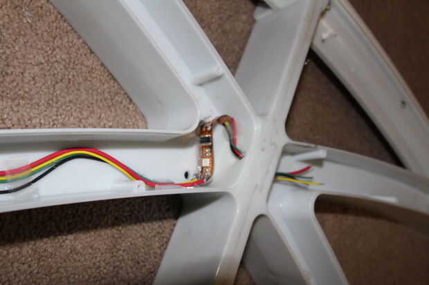 Las baterías son simplemente calientes pegado al exterior de la llanta, como se ve en la foto, un agujero es perforado en el marco donde los cables necesitan alimentarse a través de, y después alimentadas a través del agujero y estén soldadas en su lugar, el agujero se llena con pegamento caliente. También los cables de sí mismos son caliente pegado hasta el marco a permanecer alejados de la luz de los LEDs y para evitar moverse mientras que monta.
