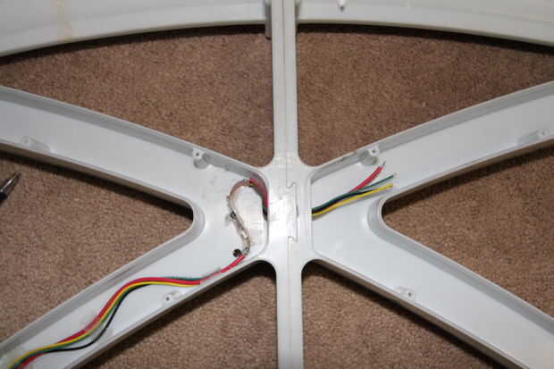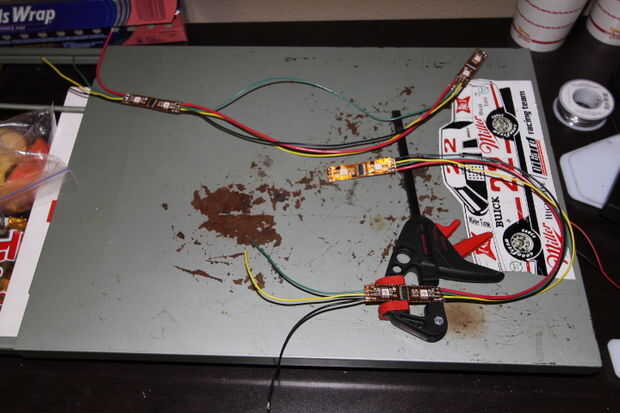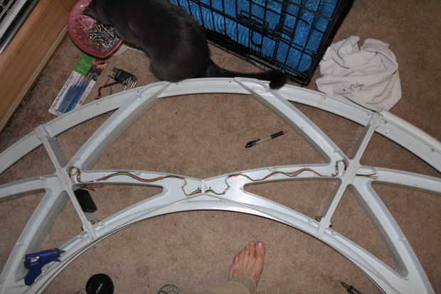 Así que para empezar, echa un vistazo en la tercera foto de arriba. Se trata de cómo cada una de las seis secciones va por cable. Medir a 4 hilos de cada color, dos que son las piernas largas entre el final de la sección monorrueda y el centro de su sección, un cable más pequeño para ir a través del agujero en el centro de la sección monorrueda y un pequeño cable para ir entre las secciones donde sus viejo tornillos conduce corriente solían ser. Corte los cables a las longitudes se siente necesario y los extremos de la tira. Después se tira de los extremos, les lata también (poner un poco de soldadura en ellos, ayuda con la soldadura a los LEDs.)