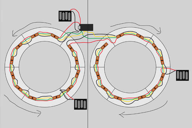 En el diagrama de cableado si se va a imaginar plegable el diagrama de abajo de esa linea negra por la mitad, sería cómo los dos lados alinean con de la monorrueda. Cada sección de LED en el diagrama está en realidad dos secciones de LED conectadas junto, pero por tiempo hacer el diagrama de ahorro me omití las mitad de las secciones de LED. Todavía debe conseguir el punto.
