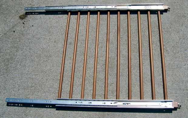 Abra las guías y sujete a los rieles de la mitad con los tornillos de #8 incluidos (excepto el 3/16 agujero en la barra inferior de la mitad-riel fijo). Dejar todos los tornillos ligeramente flojos, excepto en los extremos exteriores. Las guías serán capaces de girar ligeramente alrededor de éstos, permitiendo alinearlos.