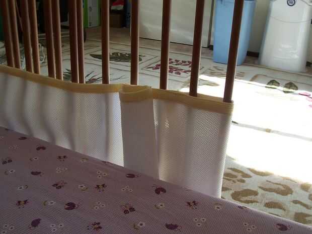 Ate un extremo libre hasta el final de la baranda móvil, ate el centro de ese lado en el centro sobre el riel fijo (tendrá que coser una cinta de tela en el parachoques) y otra vez en la esquina del riel fijo. Cuando el carril se abre, el parachoques flex y doblez, manteniendo los puestos de ferrocarril cubiertos.