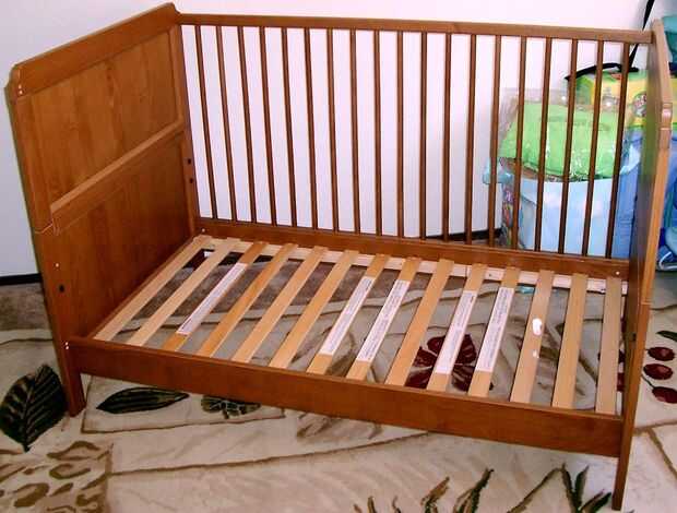 Montar la cuna normalmente, dejando un carril lateral. Este es el tren que se va modificando en un panel deslizante. Para la versión que construí, se montan los paneles de soporte del colchón y la base en su posición más baja (en cuanto a la cama del niño).
