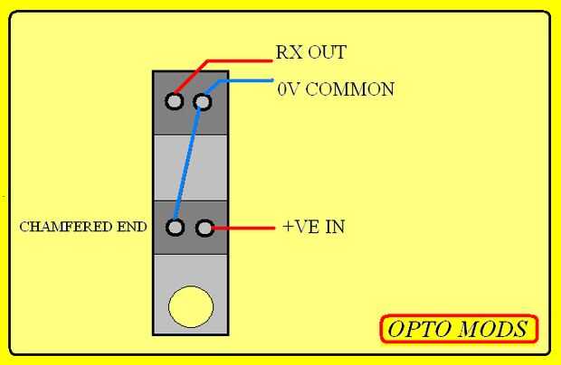 Una vez que el opto ranurado es cortado y modificado para adaptarse, su tiempo para preparar las conexiones, mirando la parte trasera el opto y el LED con el borde biselado más cercano, corte la superior izquierda e inferior derecha conexión corta, como un poste terminal. A continuación doblar la parte inferior izquierda diagonalmente a la parte superior derecha y soldar los dos juntos, esto forma la conexión común o 0 voltios.