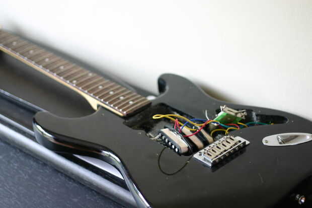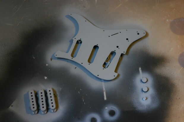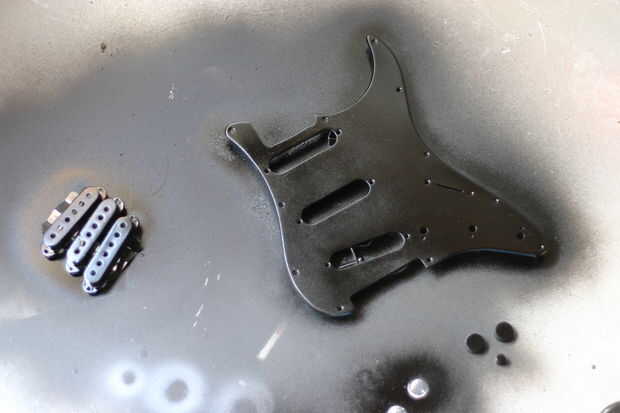 Así que tuve una guitarra bastante barata que quería modificar y aprender. Todas las piezas de plástico de la guitarra donde un plástico blanco, en cambio quería cambiar a negro para una mirada diferente a la estándar blanco y negro que veo en todas partes a un negro más negro look con los metálicos destaca entre los tornillos, pastillas y cadenas.