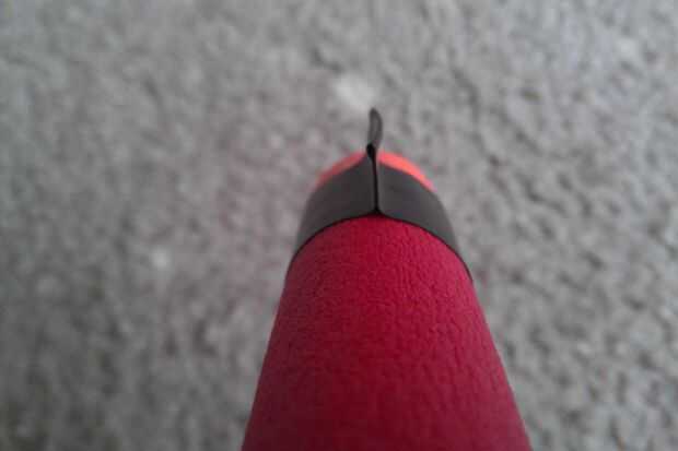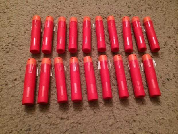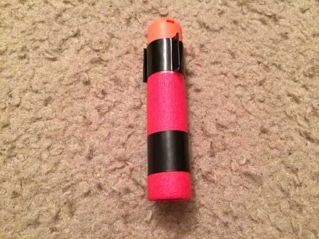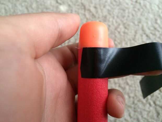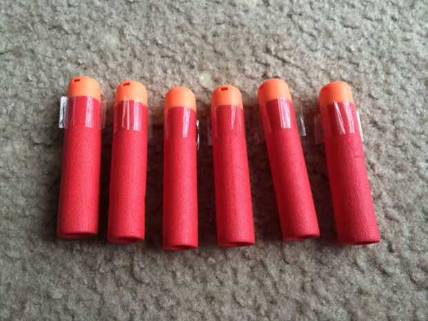 Para modificar los dardos de la Mega, simplemente envolver un trozo largo de cinco pulgadas de cinta Scotch en la parte superior del segmento de espuma del dardo, cada ahora y entonces doblar la cinta para crear muy pequeñas "aletas". Cada dardo debe tener tres aletas. A continuación, envuelva el otro pedazo de cinta alrededor de la parte inferior del dardo como se muestra. Prueba de los dardos como hacerlos para que trabajan en la revista y el blaster, por separado y juntos en el mag.