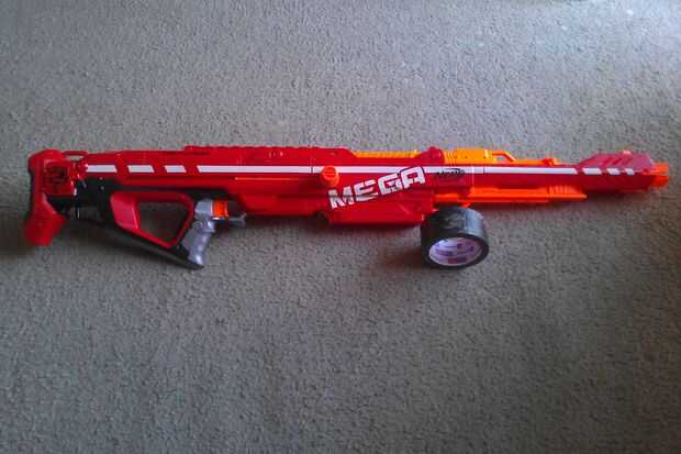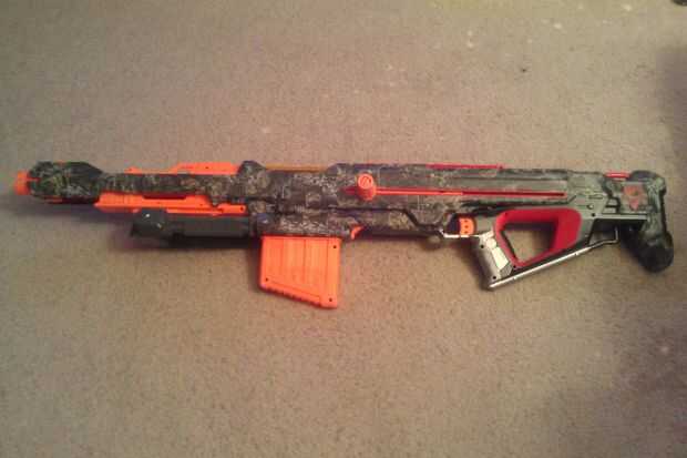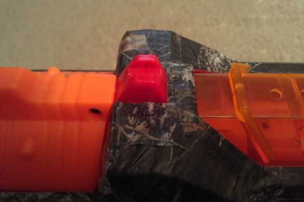 Para agregar camuflaje al centurión, primero aplicar una capa de cinta camo alrededor de la carcasa de la pistola. Esto requiere cuidado y tacto, ya que no desea cubrir piezas tales como la liberación del cargador, revista bien, mango, gatillo, Honda puntos, rieles tácticos, final de las pistas de barril, monumentos, tuercas y pernos o escudos de Nerf de stock y stock.
