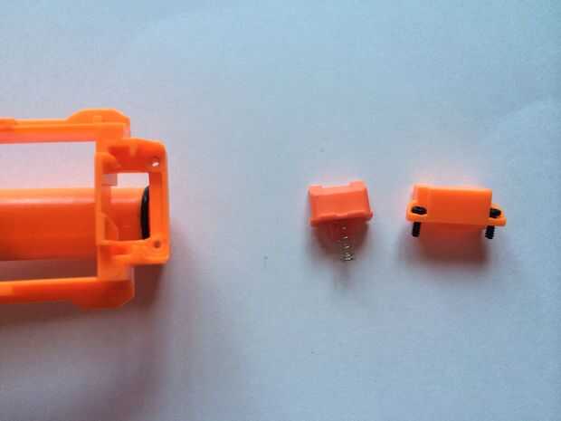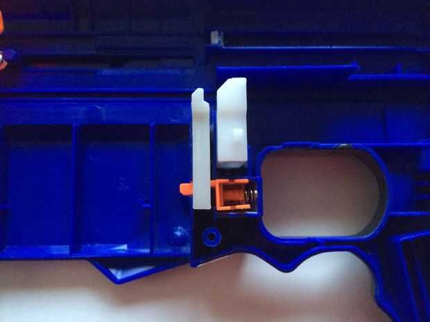 Quitar las cerraduras de la revista y el émbolo se facilitará el gatillo para tirar, la revista más fácil de quitar y el blaster más fácil cebar y cebar la. Simplemente quite las dos piezas blancas que se muestra en los cuadros 4 y 5, y las dos piezas de naranja en el perno de patín en fotos 6 y 7. Eliminar estos bloqueos permitirá al usuario de prime y se cebe la pistola simplemente inclinación en cierta dirección. También puede ser de cebada mientras mantiene presionado el gatillo y deslizando hacia atrás la corredera de cebado.