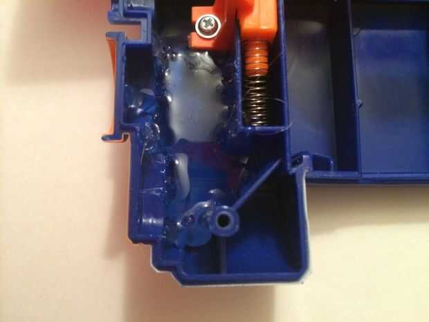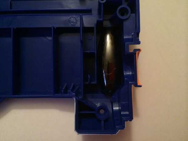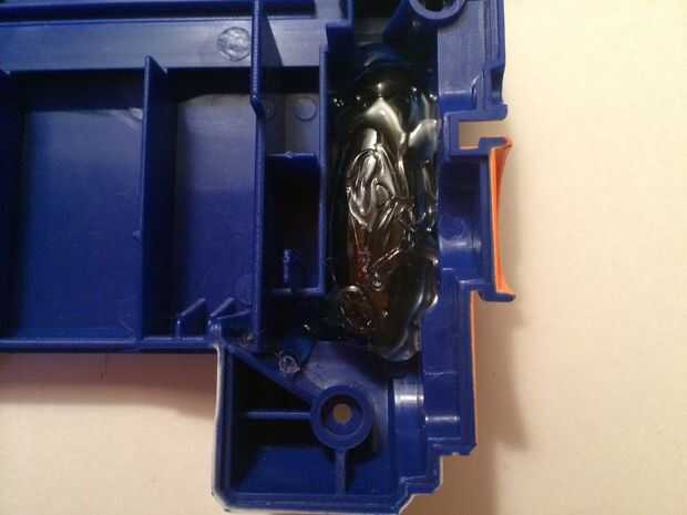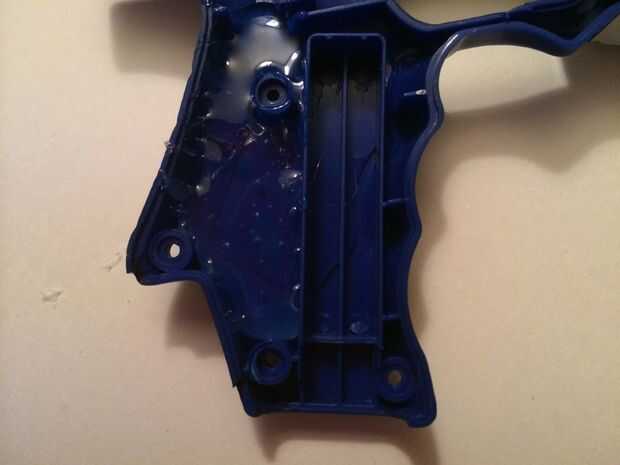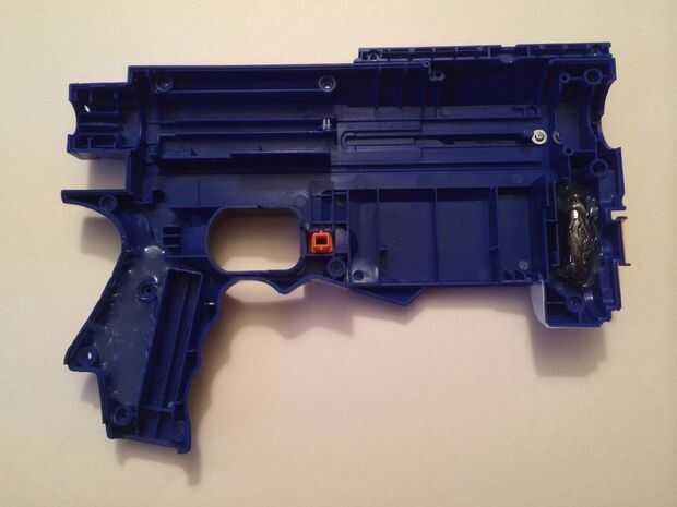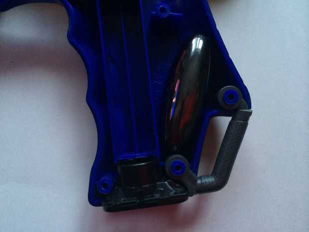 Pegamento caliente un peso del metal en el mango de la pistola y en la parte delantera el blaster como expuesta en cuadros 4 y 5. Poner un peso en cada mitad de la cáscara mejora substancialmente el equilibrio. También añadir pegamento en los lados opuestos de la cáscara. Intentar ser aseado cuando pegado para evitar la inhibición de la función de la pistola.