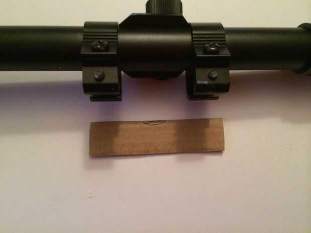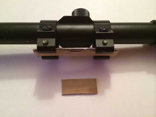 Para fijar el alcance para el blaster, cortar un trozo rectangular de cartón que se ajuste en las piezas de fijación del alcance (cuadro 3). Continúe añadiendo trozos de cartón para obtener un ajuste exacto. A continuación añadir el pegamento caliente para fijar la cartulina. Por último, caliente pegamento el alcance en la diapositiva de cebado de la Retaliator (cuadro 6). Asegurarse de que quede en la dirección correcta!
