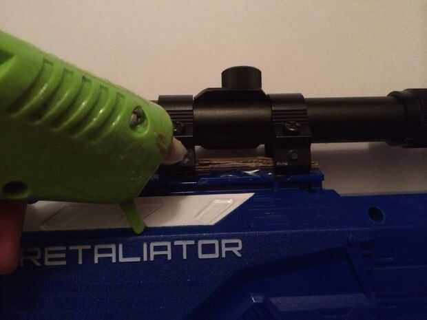 Una vez que el ámbito de aplicación ha sido pegado sobre, prueba a ver si se puede cebar la pistola tirando en el ámbito de aplicación. Si no, añadir más pegamento en pequeñas cantidades a cualquier cavidades abiertas. Trate de no tener pegamento en cualquiera de las partes si el blaster.
