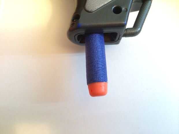 En la parte inferior del mango de la pistola, hay un pequeño espacio que puede utilizar para almacenar un dardo extra. Esto puede ser útil cuando todos los compartimientos están vacíos.