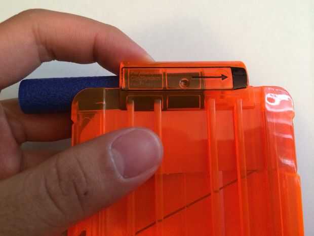 3) cargar la cantidad especificada (6, 12, 18 o 36) de los dardos y vuelva a colocar la revista en el blaster.