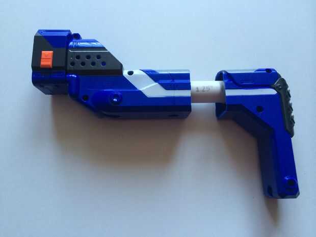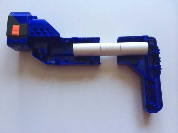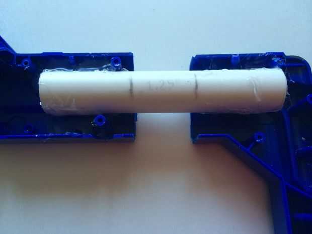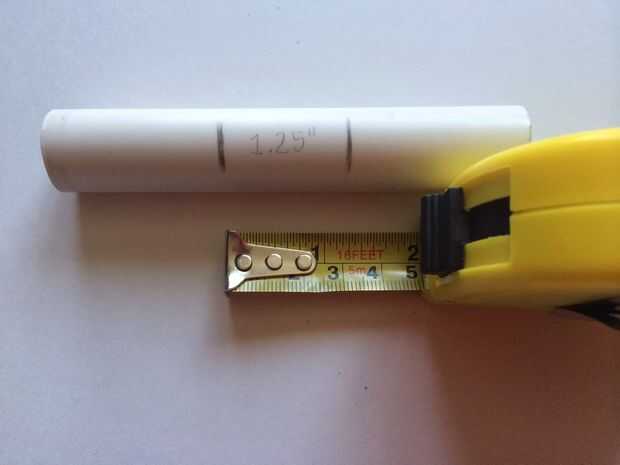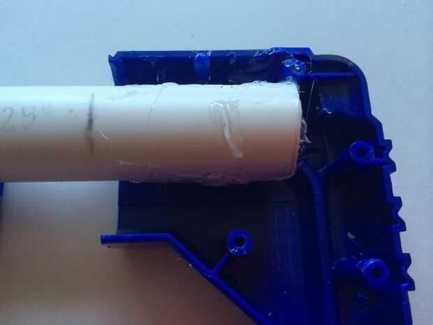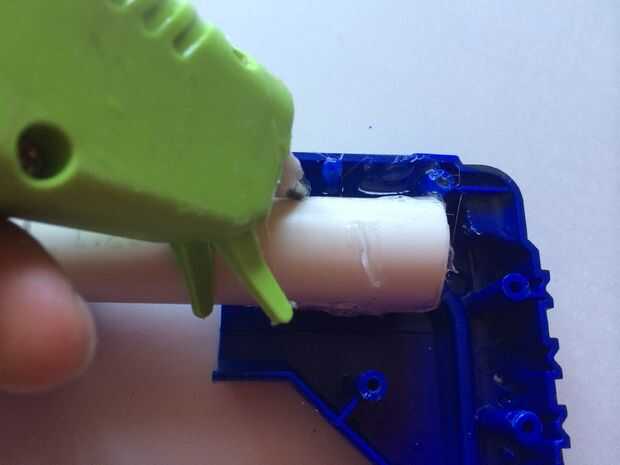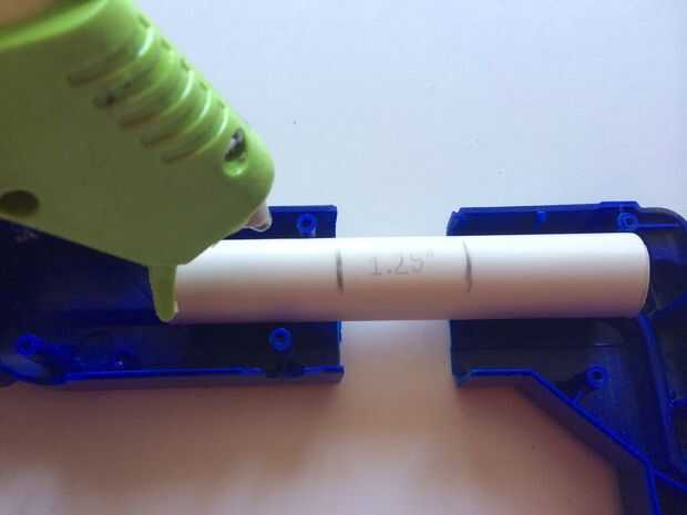 Medir y marcar un segmento de una pulgada en el centro de la tubería CPVC. Luego, alinee las marcas de una pulgada en el tubo con los extremos de la mitades stock (cuadro 2). Pegamento caliente el tubo en su lugar con una cantidad generosa de pegamento. Tratar de llenar todos los huecos alrededor del tubo con pegamento para aumentar la solidez de la acción.