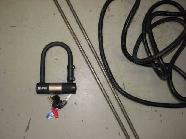 - Dos barras de metal cortan a la longitud deseada. Utiliza acero endurecido en 40" de longitud; tiempo suficiente para bloquear hasta 4 bicis. (Asegúrese que el diámetro de las barras de la misma o cerca de la cerradura original)