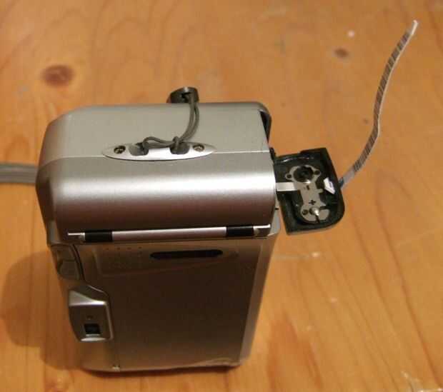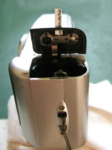 dos baterías de AA de la cámara, con el tiempo han desgastado el broche que mantuvo la puerta cerrada. entre otras cosas, he intentado hacer un broche de nuevo por el calor de la soldadura una tira de plástico de una tarjeta de identificación en la puerta. era clase de como una mortaja y espiga común pero fallido debido a las fuerzas de las baterías que quieren expulsar a.