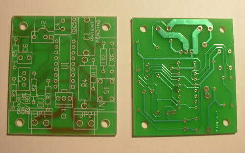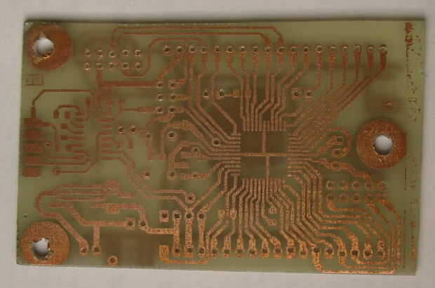 Paso 2 puede ser muy frustrante usar una plancha. Lo he intentado muchas veces pero aun con trucos inteligentes como transferencia de tóner con pasador , mi tasa de éxito es bastante bajo. Con una laminadora, los resultados son mucho más reproducibles pero tienes que laminar la placa varias veces para fundir el toner sólidamente sobre el cobre, «varios» significa «hasta que estés cansado» (15 a 20 pasos).