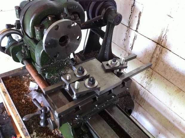 El plan era a máquina hasta algún tipo de cabezal para sostener un nuevo eje dedicado con una polea y luego encontrar un motor de donantes de algún sitio. El cabezal se estaría formado de tres longitudes de barras de acero dispuestas en forma de "U" y atornilladas. La parte inferior de la "U" se montará a la cama del torno. Las dos columnas de la "U" llevará a cabo cualquiera de los extremos del huso. Empecé por tres pedazos de barra de acero usando mi ML4 de fresado: