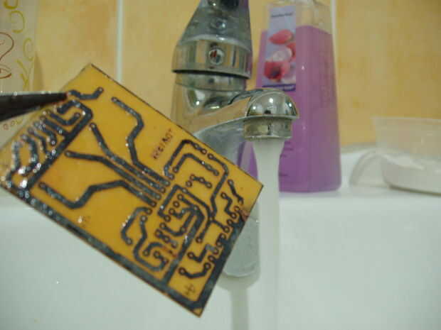 Enjuague el tablero del PWB con agua del grifo, después de la aguafuerte en la solución. Asegúrese de usar a glover al limpiarla. Se recomienda utilizar pinzas de plástico, por favor no utilizar materiales metálicos como alicates o la herramienta va a terminar como el mío, su oxidado.