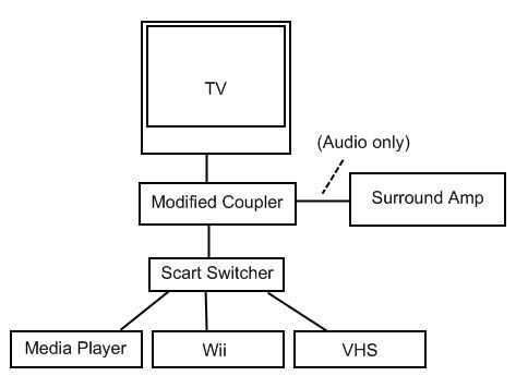 Por supuesto movió les todos juntos en una unidad, por lo que encajan en la misma entrada de Euroconector de mi TV. No biggie, pero también tengo mi amplificador de sonido envolvente, que tiene 3 diferentes fuentes de entrada de audio, entrada de 1 '5.1' (que por supuesto se dedica a mi reproductor de DVD) y 2 entradas estéreos estándar (y uno de estos entrada estéreo ya se dedica a una radio DAB...). Esto me deja con una sola entrada estéreo que tengo que decidir sobre quién debe recibir: mi reproductor de medios de red, mi VHS o mi Wii. Y no puedo. Simplemente no puedo. Así que ¿por qué no tener todos estos dispositivos con la misma entrada de audio? Ya que usando el mismo cable de scart, entonces lo que quiero hacer es tomar el audio del cable scart y alimentar a mi amplificador de sonido envolvente. ¿Simple, correcto?