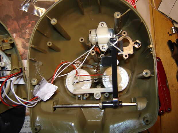 Hay un motor de hobby pequeño conectado a una cadena. Cuando el motor se enciende, se acaba la cadena y tira de una palanca, abrir la boca. Cuando el motor está apagado, un resorte tira la boca cerrada y desenrolla la cadena del motor.