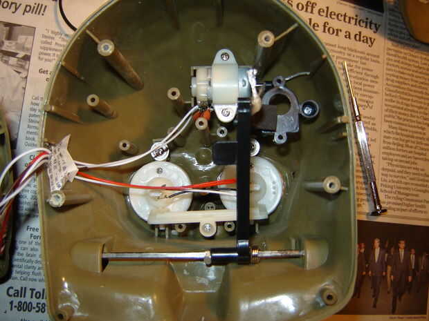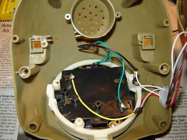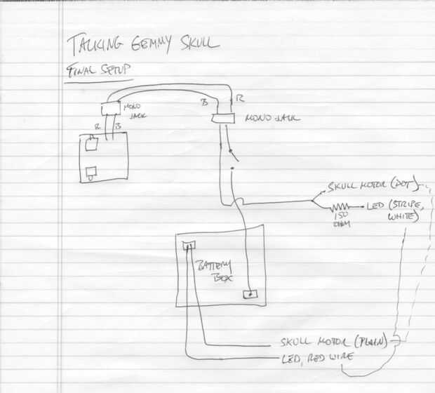 Sólo hay dos cables al control del cráneo, usé un 1/8 mono teléfono jack, conectado a la batería, interruptor, motor, y ojos de LED.