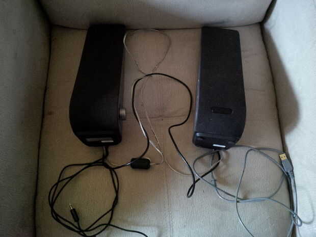 La perilla del volumen es un poco de un problema. Ya que se encuentra en el otro altavoz de Dónde está el módulo IR, se necesitará un cable para conectar al amplificador. Para mí esto no es gran cosa, ya que los altavoces van a quedar a cada lado de mi monitor. También, el cable de audio desde el altavoz volumen ya tiene que ir a uno, así que ¿qué es un cable más? Por supuesto, esto también significa que el cable de audio de la computadora tiene que ir a la bocina de volumen. No podría tener una perilla de volumen, pero yo estoy eligiendo funcionalidad sobre la estética.