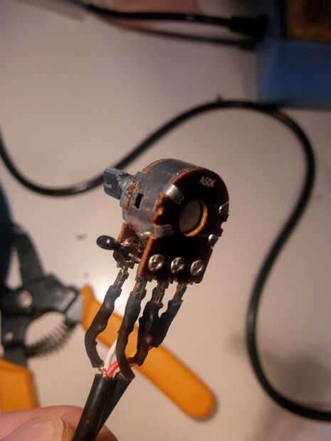 - Con el cable de enlace utilice el extremo con la tierra solo. Coloque la conexión a tierra en el otro conector de tierra y los otros dos a cada uno de los pines del potenciómetro medio.