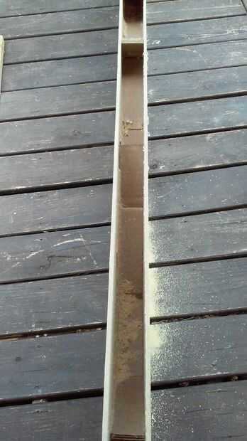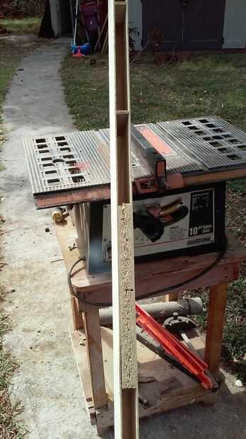 Ahora se puede ver lo que quiero decir acerca de "especie de" hueco. Para restaurar la integridad estructural de la puerta, usted necesitará llenar la brecha. Tomar la pieza descartada y retire el material de la superficie de la Junta de marco de madera. Usé mi sierra de mesa antiguo para lograr esto el tope lateral en el lugar y cortando los materiales de la superficie.
