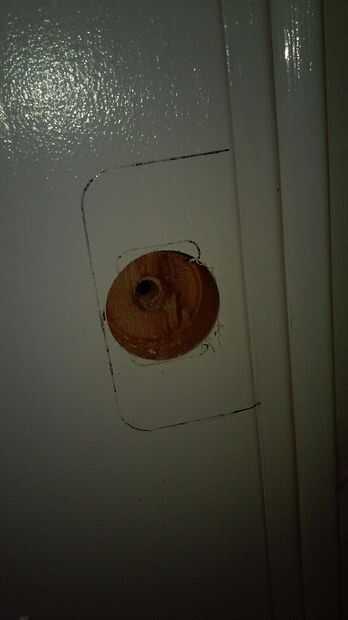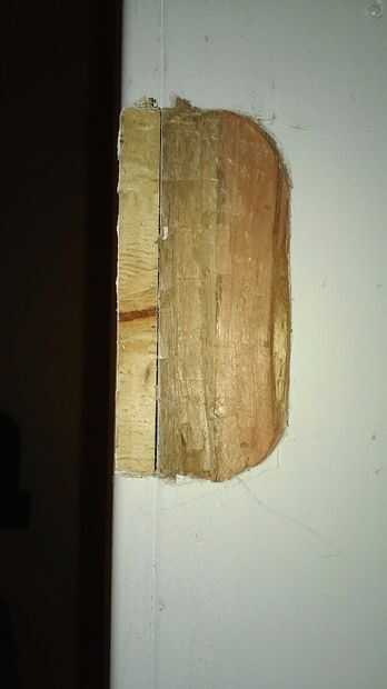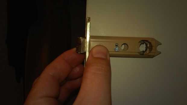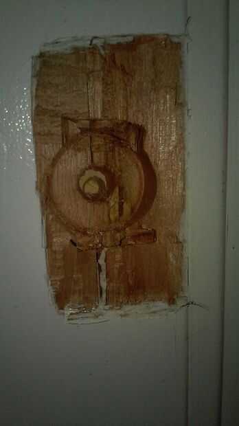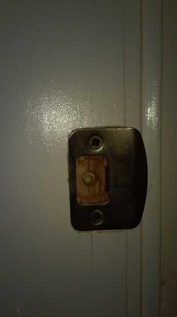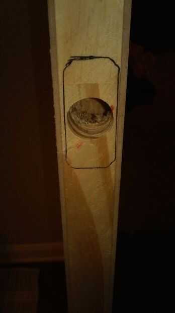 Coloque la placa de cierre contra el marco de la puerta y lo trace. Usé una broca de paleta para quitar la madera de donde engancha el pestillo. Quitar la madera sobrante con un formón para permitir la instalación al ras e instalar placa de cierre.