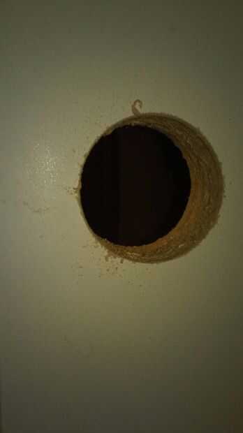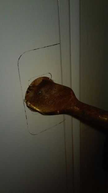 El siguiente paso es instalar la manija y cierre. Si tienes una plantilla de instalación de pomo usarlo. De lo contrario, mida una distancia adecuada de la jamba para el centro de la perilla de la puerta. Recortar con una sierra. Utilice una broca de paleta para cortar el seguro camino.