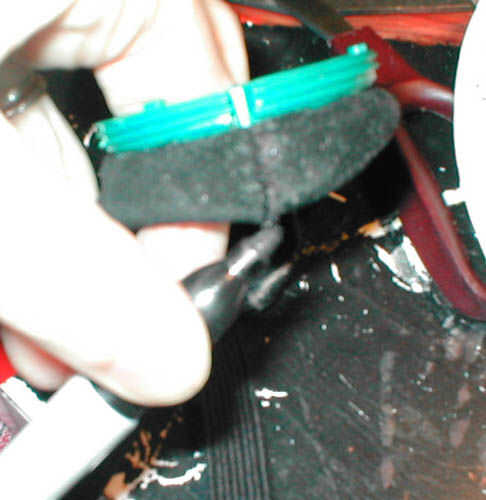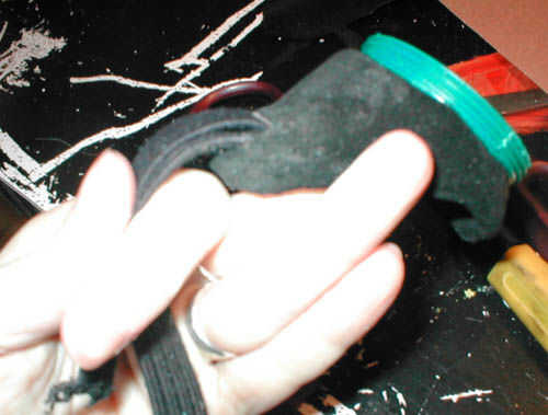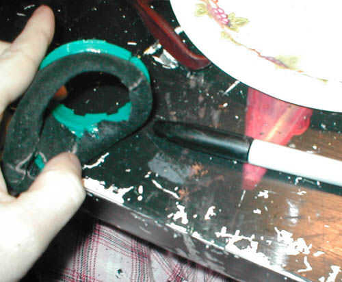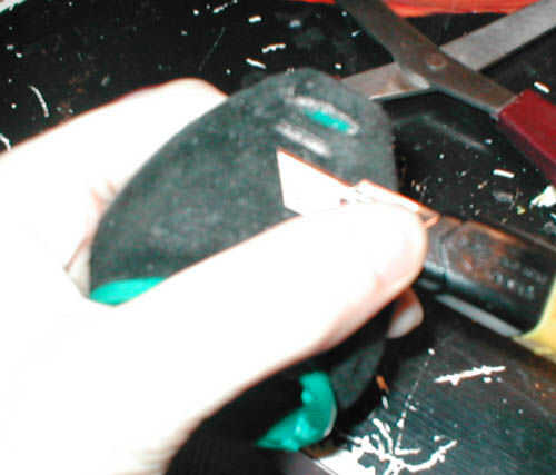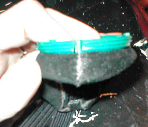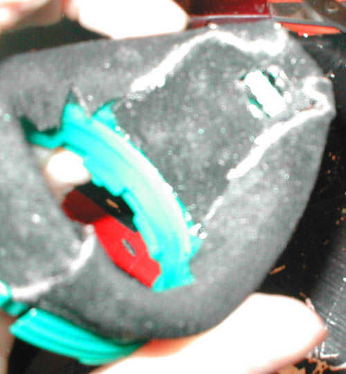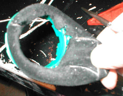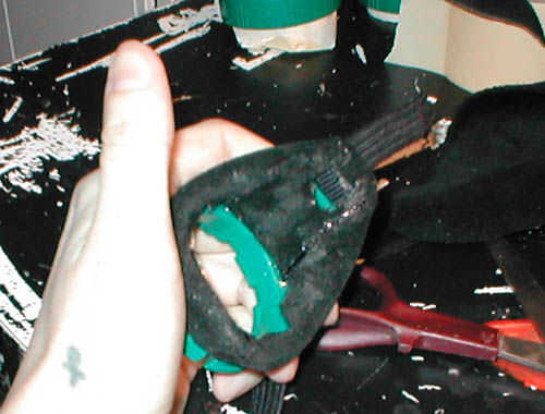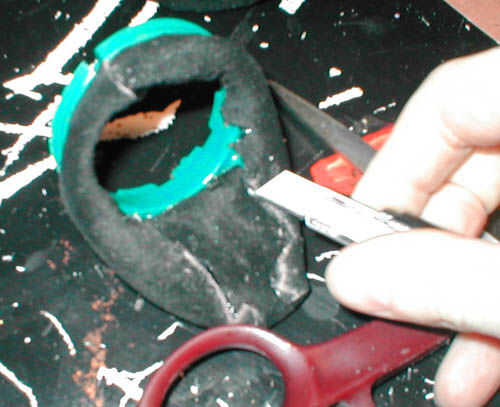 También hice los agujeros para la cinta de la cabeza hacia fuera. Acabo de sentir a través de la gamuza con mi uña del dedo y utiliza la navaja retráctil para cortar agujeros en el cuero sobre donde la original agujeros donde ya en.
