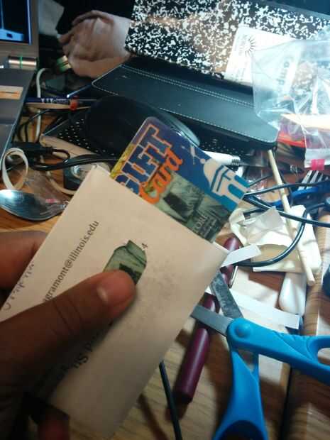 este es mi construcción acabada de una billetera de papel instructivo por theRIAA (ver carpeta de papel). He puesto algunos toques en él añadiendo mis propios dibujos estilizados y datos personales. Su escrito hacia atrás porque la iSight de Apple mu