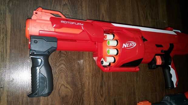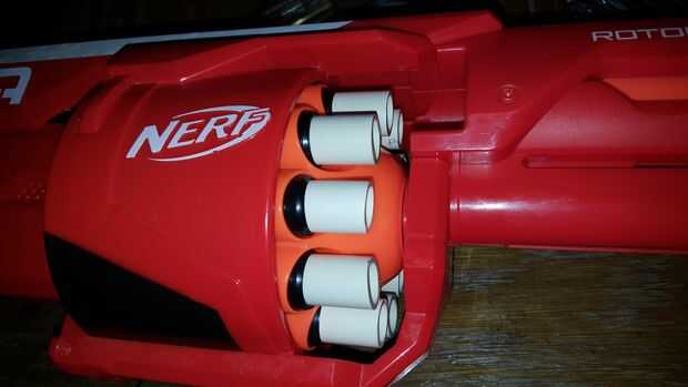 Presione la cinta barriles en el cilindro de la RotoFury. Cargar con élite dardos y estás listo para ir. Como se puede ver, no hay permanentes modificaciones a lo blaster. Si desea volver a tirar dardos de Mega, simplemente coge los barriles de cpvc con una pinza y tire hacia afuera.