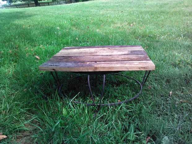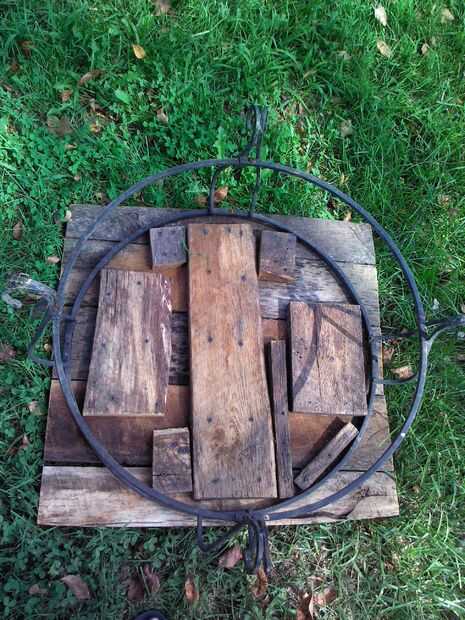 Primero alineado mi madera de desecho. Entonces coloqué el marco de hierro sobrante (del viejo fogón) encima de la madera. Luego atornillado en tableros para caber dentro del borde del marco (no se ve muy pero estoy utilizando madera de desecho, y hace el trabajo). Luego volcó el marco, mesa, y ahora tengo una mesa.