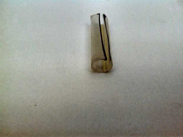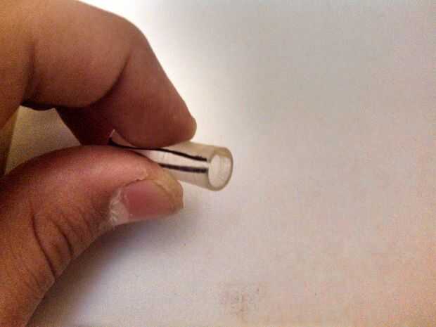 Ahora desmontar la pluma y marca de 1 pulgada de su cuerpo como se muestra en el cuadro 1. Después de corte el área marcada y con la ayuda del cuchillo corta una tira haciendo un espacio. Como se muestra en la foto número 3.