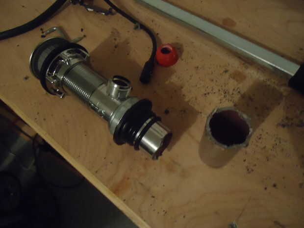 Para hacer todo este trabajo, tuve que cortar la sección de la tubería de desague que va en el más amplio por lo que habría espacio para las baterías. Al hacer esto, asegúrese de que usted deje suficiente espacio para que el tubo más pequeño todavía tiene suficiente longitud para sentarse firmemente en el tubo de mayor diámetro. Si deja aproximadamente 2 pulgadas debajo de la tuerca, usted debería estar bien.