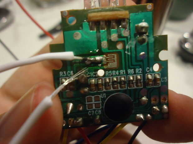 Para el otro cable, tenemos que hacer nuestro propio contacto de la zona por encima de donde esté solo con el cable. Si intenta conseguir un pegote de soldadura en allí ahora, va solo pop espalda derecha otra vez. Para hacer palillo, deberás rasguño la capa apagado el rastro hasta que vea la parte Brillante de la placa por debajo de ella. Usé la punta de un cuchillo de bolsillo. Tenga cuidado porque usted podría sea cero a través de la Junta o hacer una conexión que no debe existir ninguna conexión. Una vez que tienes una zona para trabajar con, poner la punta de la plancha a nuevo contacto y derretir un pegote de estaño hay. Luego tome el extremo de su cable y conéctelo a la Junta. Asegúrese de que ambas conexiones son realmente sólidos (a diferencia del descuidado en mi foto). Ojala las fotos te dan una idea clara de donde todo debe ser ahora.
