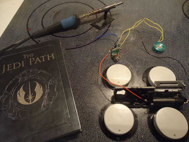 Lo primero que debemos abordar antes que nada es el interruptor. Al parecer la Junta Darth Vader viene con los cables ya soldados a la placa, pero el Anakin utiliza un botón de contacto, que significa que tendremos que hacer un alambre en contacto con nosotros mismos. En la foto de primer plano de la Junta, se puede ver lo que hice para hacer este trabajo. Afortunadamente, para uno de los cables de conmutación puede usar la conexión al lado de C6 que ya está soldado. (Prometo que volví y limpiar que mal hecho conexión antes de que todo fue hecho.)