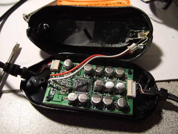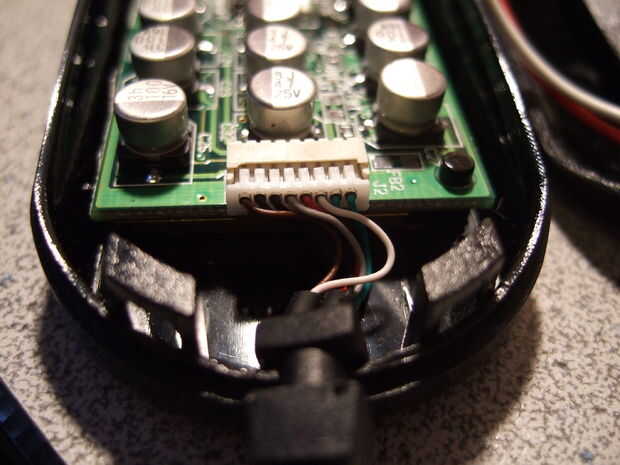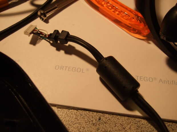 Abrimos la carcasa pequeña quitando los tornillos de la parte posterior. Podemos ver muchos condensadores y un indicador LED. Los auriculares están conectados a la PCB por un solo enchufe. Vamos a cortar el cable entre este enchufe y los auriculares y reemplazarlo con tres auriculares de 3,5 mm.