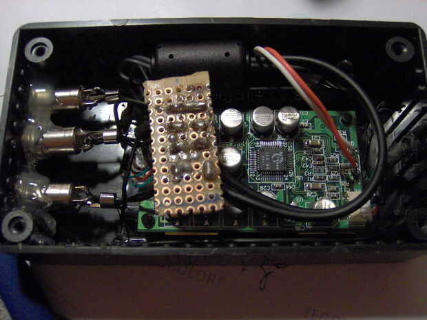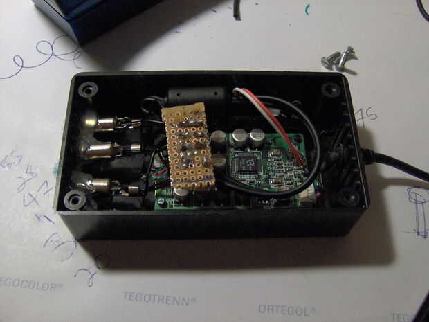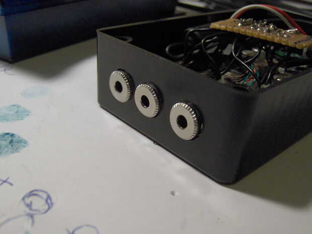 Haz un cuadro de proyecto que cómodamente mantener todos estos componentes y perfore agujeros para los conectores de auriculares montar. Perfore un agujero en el otro lado de la caja para el cable USB a venir, si se conecta a la placa por un conector. Asegúrese de que el agujero es lo suficientemente grande para el conector a través de la alimentación. Si no utiliza un conector, o desoldar los cables y alimentarlos a través del orificio o utilice una lima para tallar una muesca en el cuadro de proyecto para el cable en.