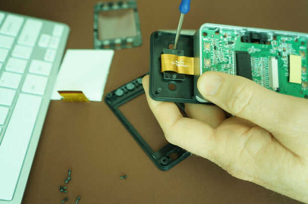 Ubicar el sensor sigue atado frente de la caja. Hay 6 agujeros con tornillos de sólo 4. Desea quitar los tornillos de los orificios de esquina y dejar los dos en el centro (por ahora). Esto liberará el conjunto de lente y cámara de la parte delantera de la caja.
