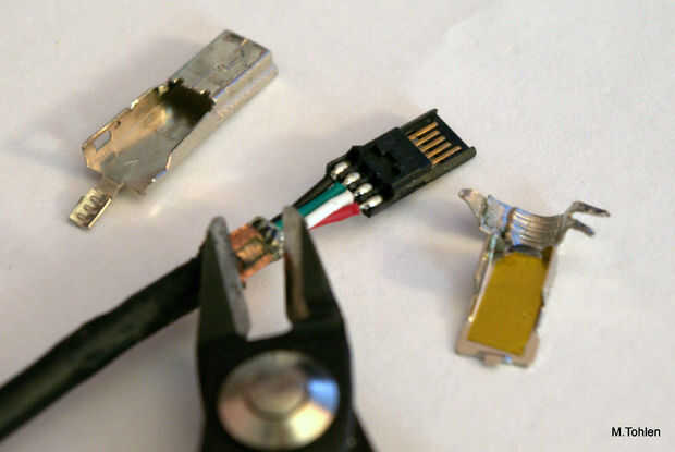 -Desmontar la carcasa de metal. Para mi cable, he doblado a las lengüetas de alivio de tensión y separa la carcasa principal. Lo siento, que no tengo una foto mejor de este paso!