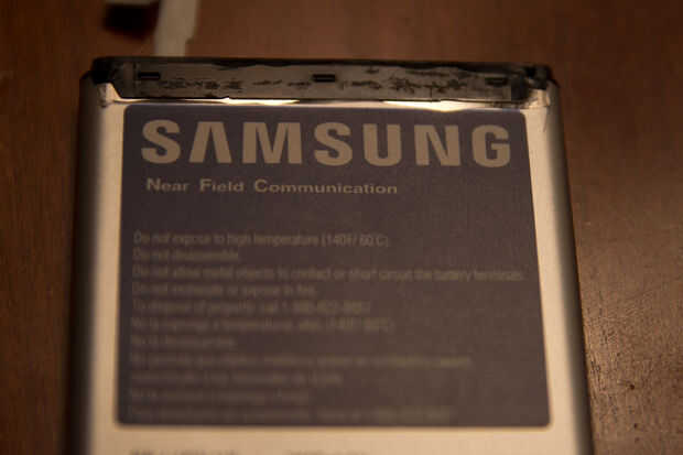 Las zonas altas de la batería que causan problemas con la contraportada son principalmente alrededor de los bordes de la batería.  Cuidadosamente recortado una cantidad muy pequeña de plástico negro de la orilla, como es visible en la foto.  Yo también recorta la etiqueta engomada metálica lejos el borde levantado.  Recorte de los puntos altos y cortar la etiqueta engomada permita que la batería se siente más profundo en el teléfono.