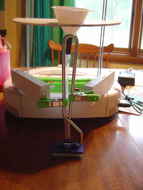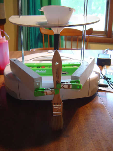 Lo que utilizan para pintar con (la brocha/rodillo/etc.) se celebrará en el lugar con dos clips. El tubo debe quedar entre el aplicador de la pintura y el robot. Puede grabar el tubo al cepillo si no permanecer en el lugar en su propio.